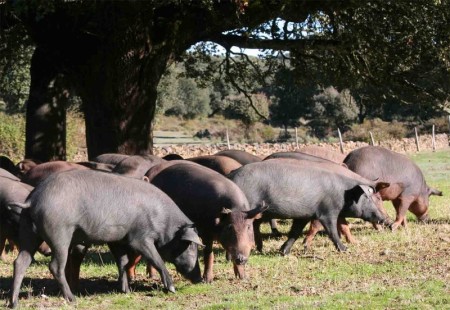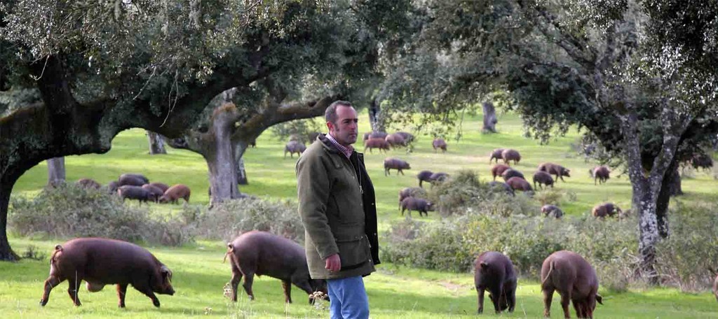 Cerdos Ibéricos que engordan en las dehesas que Cándido Flores dispone en los mejores encinares de la península Ibérica, situados en el Valle de Azaba (Ituero, Campillo, Fuenteguinaldo, Espeja o Carpio), en la provincia salmantina, y en la dehesa cacereña de El Puntal de Arriba.